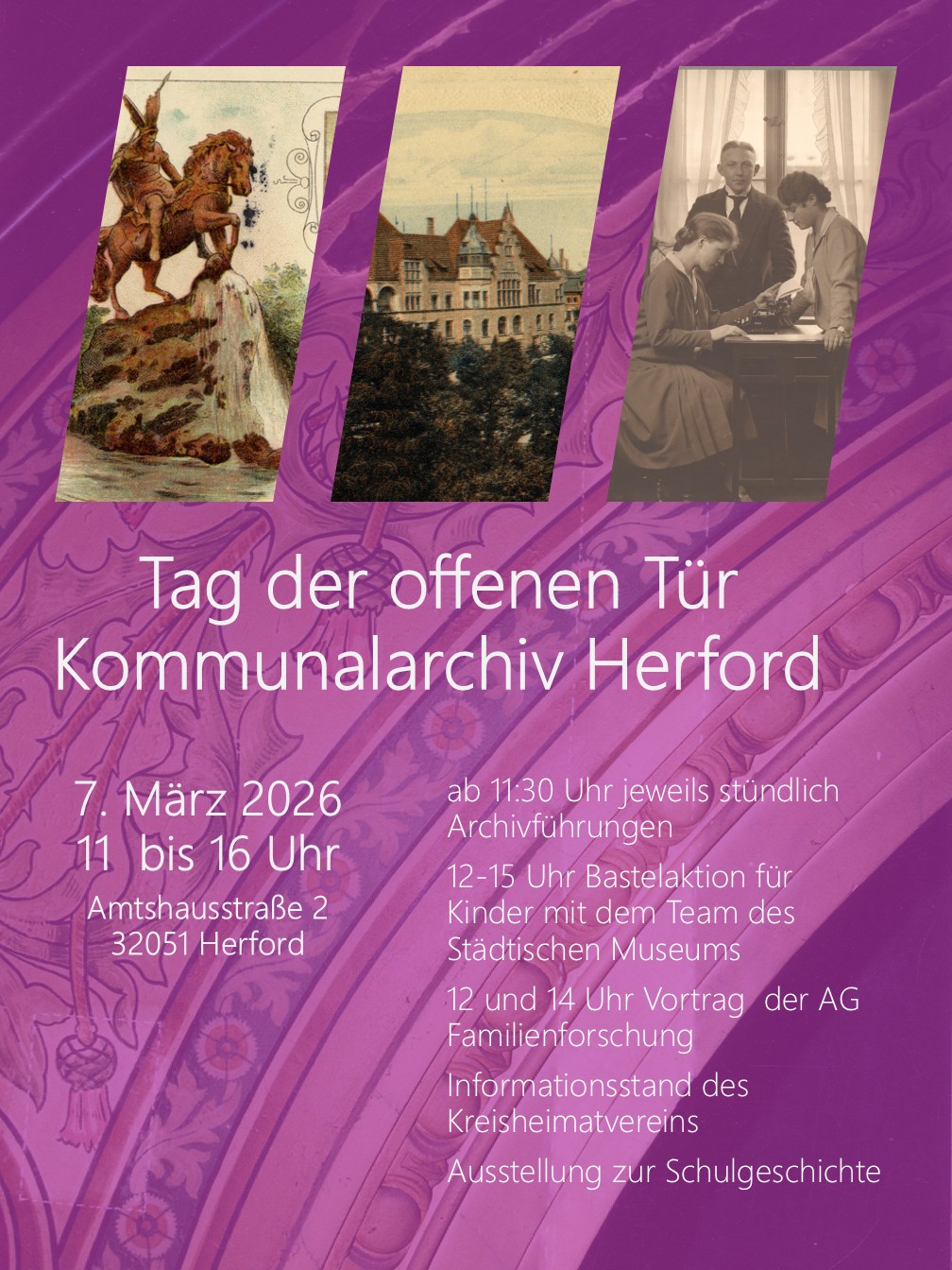 | 07.03.2026 | 14:00 | Vortrag "Genealogische Fundstücke im Herforder Kommunalarchiv" beim Tag der offenen Tür Ort: Kommunalarchiv Herford, Amtshausstraße 2, 32051 Herford ![]() |
